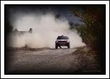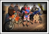 Je černočerná tma a vřískající budík nás nekompromisně žene z pelechů. I vedle, u Oldy, už se něco hýbe a i oni vstávají. Dnešek bude náročný. Olda i Juraj mají svůj první den v marocké poušti. Mají naplánován přejezd celého testu a ten dnes měří 386 kilometrů. K tomu musíme připočíst ještě přes padesát na start testu, které Juraj musí ujet po ose. Motocykly už jsou od včerejšího večera připraveny. Oldův si spokojeně hoví naložen v přívěsné boudě a Olda jej vytáhne až na startu testu. Jurajův je naložen v garáži našeho karavanu jen tak napůl. Abychom nemuseli opět vymontovávat přední kolo, když motorka do karavanu nevejde celá, nechali jsme její přední kolo a řídítka vystrčena ven z otevřených dveří. Ty jsme jen tak přidrátovali, aby v případném větru netřískala. Ze zlodějů jsme strach neměli i kdyby snad o něco měli zájem, udělali by takový rachot, jenž by nás určitě probudil. To byl důvod proč Juraj musel ranních padesát na start testu po ose. Nyní v chladném, černém ránu uvádíme postupně naše tělesné schránky do provozního stavu. Milan starší vaří kafe, my tři ostatní vytahujeme motorku a ladíme poslední nezbytnosti. Juraj se obléká do jezdeckého a postupně na sebe natahuje to nejteplejší, co má. Oldova výprava ještě snídá, když my po domluvě startujeme a jedeme k nedaleké pumpě tankovat naftu.  Je půl sedmé, což poznávám nikoliv pohledem na hodinky, ale podle rachotu prvních projíždějících motocyklů, jež projíždějí kolem pumpy a mizí ve tmě. Už máme natankováno, kolem nás sviští další a další motocykly. Olda pořád nejede a my jsme čím dál tím nervóznější. Nakonec muka čekání nevydržíme startujeme a vyrážíme do tmy za všemi ostatními. Oldův Jezevčík je mnohem rychlejší a tak nás jistě brzy dojedou. Uháníme stovkou ani ne patnáct minut a už nás Juraj předjíždí a signalizuje ať zastavíme. Vyžaduje si kuklu, kterou před odjezdem, když mu ji Milan nabízel, zavrhnul. Oldovo auto nás v rychlosti míjí a tak i my vyrážíme vstříc dalším kilometrům. Juraj na motocyklu rychle dohání Oldu, oba postupně mizí a tak ve tmě zůstáváme sami. Ukrajujeme další z mnoha dnešních kilometrů, strach z bloudění nemáme, každou chvíli nás předjíždí další a další motocykly.  Tma pomalu ustupuje rannímu šeru. Sjíždíme do širokého rozeklaného kaňonu a já lituji, že je ještě tak málo světla, abych jej mohl vyfotit. Po jeho dně pak pokračujeme v cestě. Míjíme mnohé osady a vesnice. Později kaňon opouštíme a s přibývajícím světlem se i krajina čím dál víc otevírá. Vdáli už vidím na krajnici zaparkováno Oldovo auto a víc vlevo všechny závodníky jež nás ve tmě postupně předjeli. Dochází mi, že jsme nic nezmeškali, že zde stejně všichni čekají na první sluneční paprsky a s nimi na start prvního z nich do dnešního testu. Parkujeme vedle Oldy a já netrpělivě vyskakuji, abych zachytil tuhle neopakovatelnou atmosféru.  Pořadatelé závodníky rovnají podle výsledků průběžného pořadí, tak jak budou postupně startovat. Běžím, abych zachytil start nejlepších z nich, ale také hlavně proto, abych zachytil start Jardy Katriňáka. Stojí vepředu, mezi nejlepšími. Přeji mu mnoho úspěchu, štěstí a zdaru a Jarda je rád, že se setkává s někým z domova a děkuje za podporu. Věděl o nás, ale v tom kolotoči jsme se ještě neměli možnost setkat, takže teprve až nyní. Jdu dopředu, kde už startují první jezdci. Prvních deset startuje po jednom v dvou minutových intervalech, ti ostatní po dvou, každých 30 sekund. Fotím startující jezdce a čekám na Jardu. Vyběhl jsem z auta nalehko jen v mikině a nyní mi je v ledovém větru strašná zima. Krčím se za terénním autem pořadatelů a zde v závětří je lépe. Jarda zamával, startuje a mizí v oblaku prachu kdesi mezi vzdálenými kopci. Vracím se nazpátek k našim autům. V řadě závodníků vidím Ivo Kaštana, fotím i jeho a přeji hodně zdaru. Pak už se utíkám obléknout. U nás vrcholí přípravy k odjezdu. Je dotankováno, kluci oblečeni a nabaleni vším, co můžou potřebovat. Tak už jen společná fotka na rozloučenou, pak ještě jedna, protože nám tam zrovna projíždí autobus, startování motorek a už nám oba mizí v dáli.